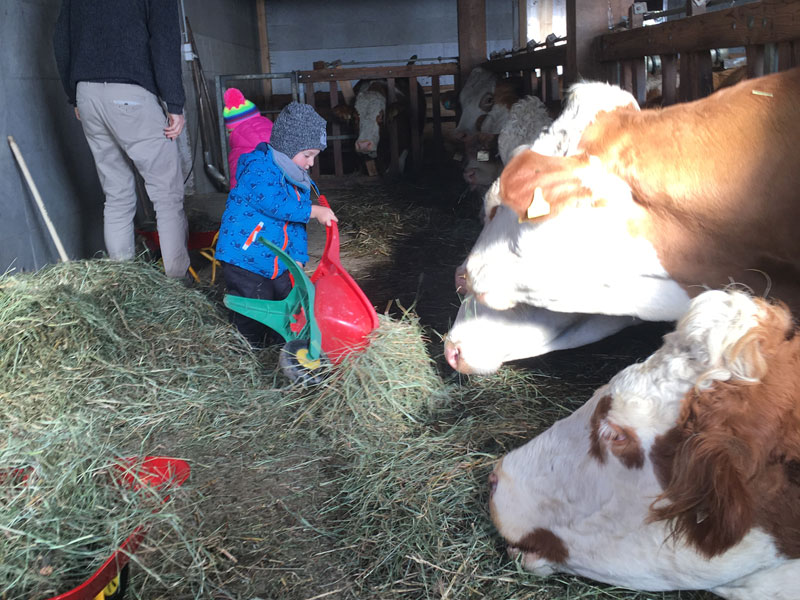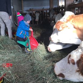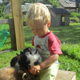 ... und im Anschluss an die gemeinsame gesunde Jause besuchen wir die Tiere am Bauernhof. Wir werden den tiergerechten Umgang erlernen, in dem wir sie versorgen, sie streicheln, mit ihnen kuscheln,… und viele Erfahrungen mit allen Sinnen machen.
